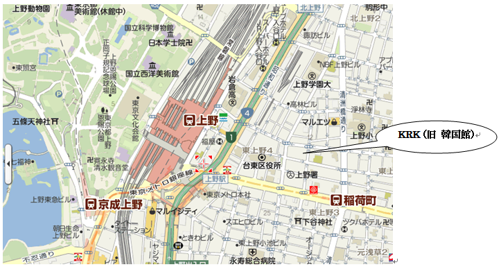 上野駅からは、上野駅を背にして浅草通りを進んで頂き、下谷神社の赤い鳥居が右手に見えましたら、その鳥居をちょうど背にする形で左に曲がって下さい。そうして少し歩きますと、前方左手にKRK(旧韓国館)のあるコーデン上野ビルの看板が見えてきます。(当店は3Fです)